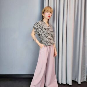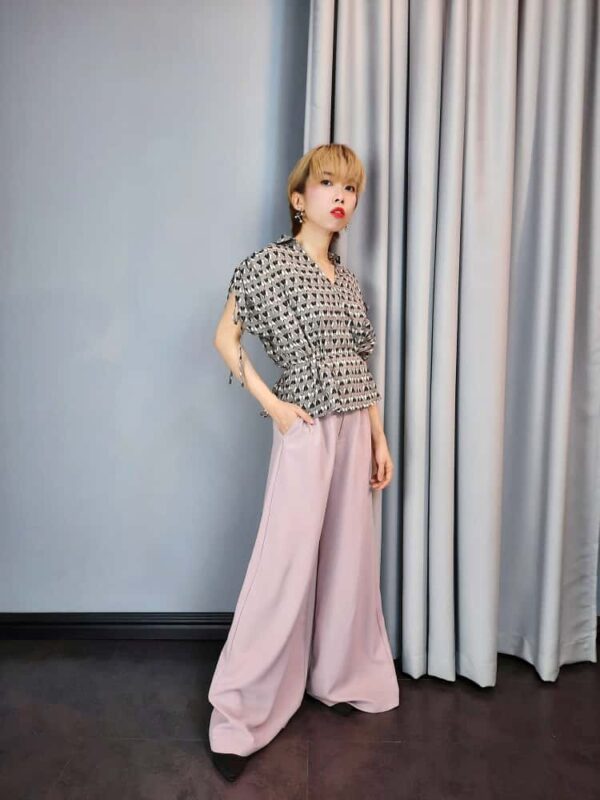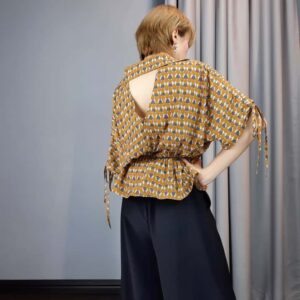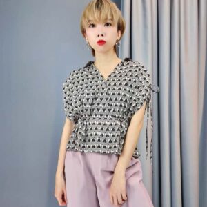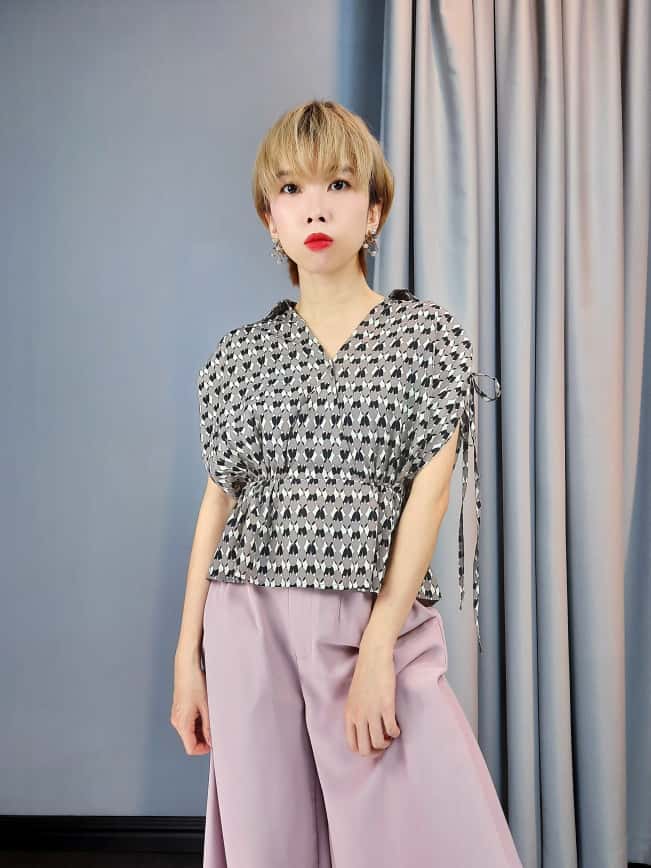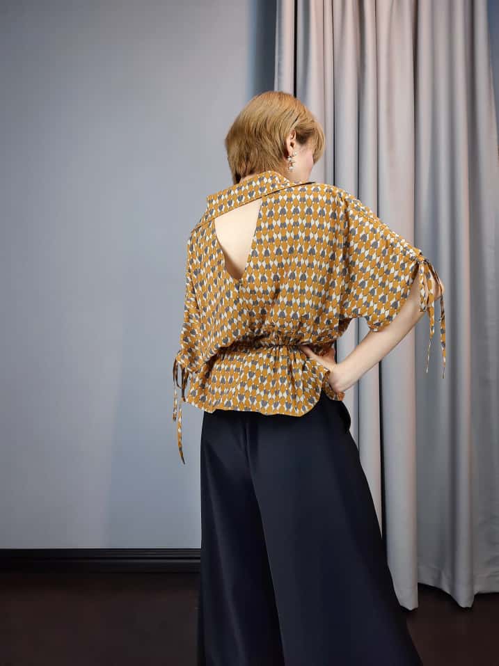 A short-sleeved blouse featuring a geometric print and a peplum or cinched waist. It has a V-neck in the front with collar and a cutout detail on the back. The sleeves have tie details on the sides.