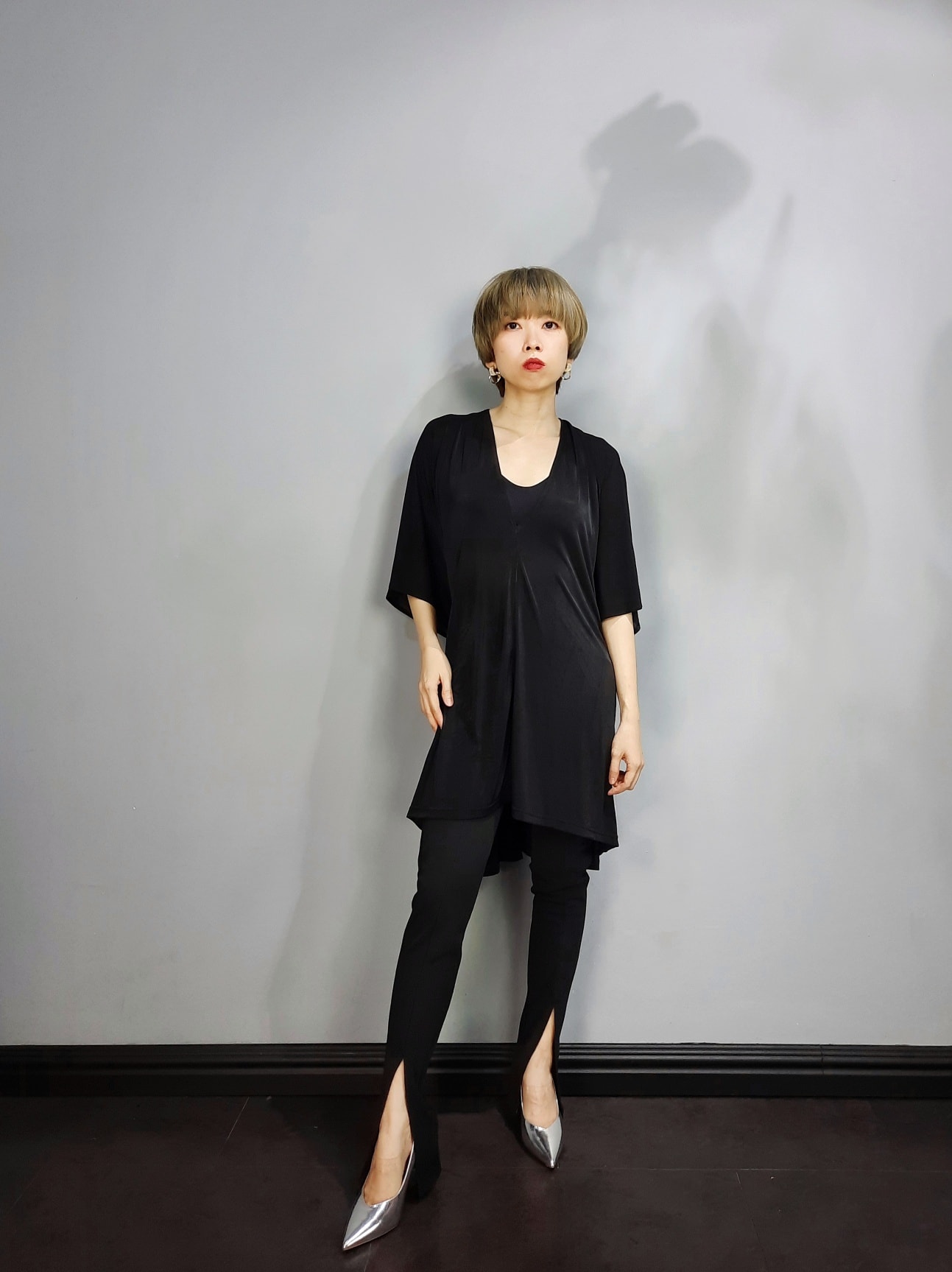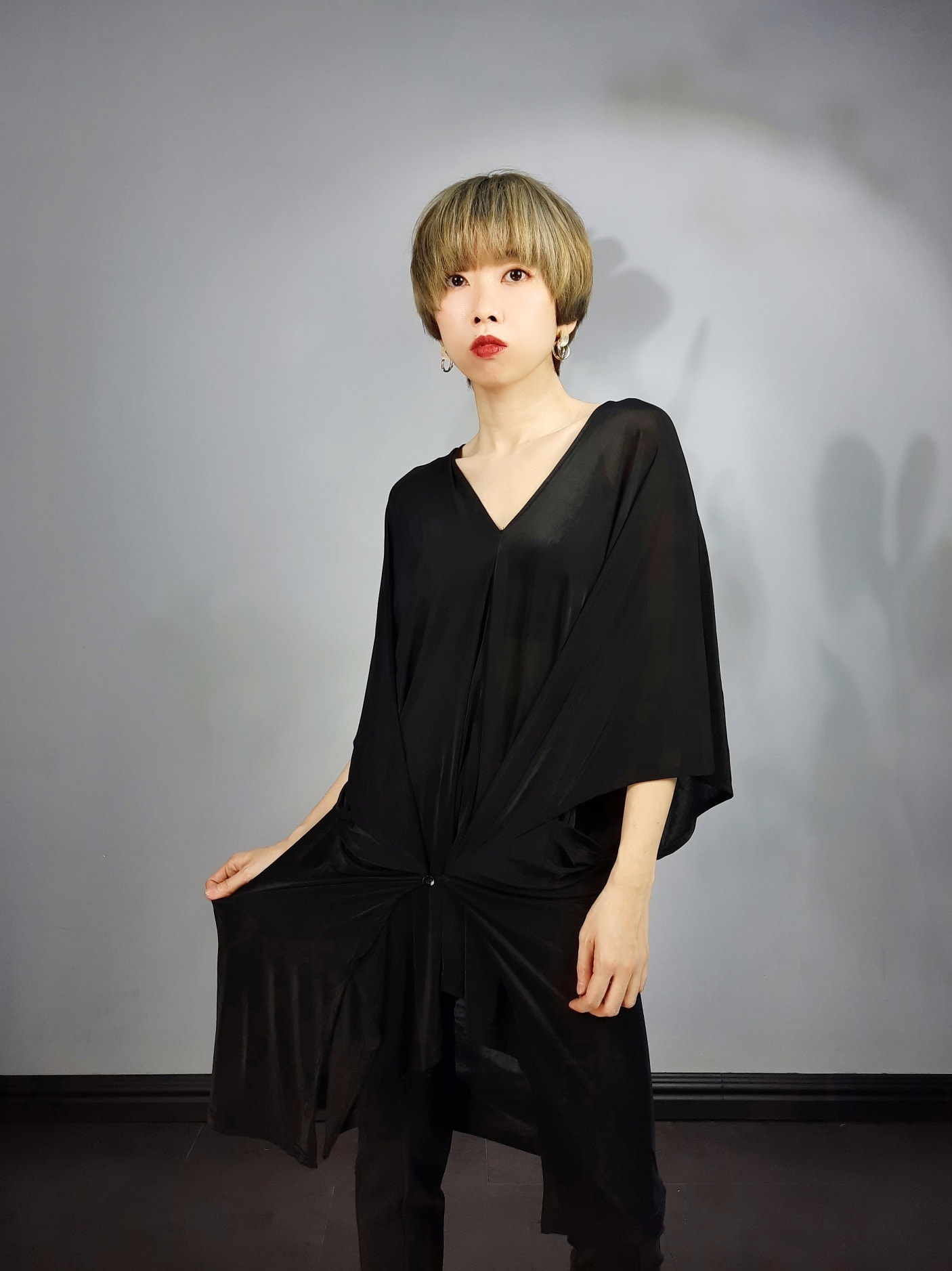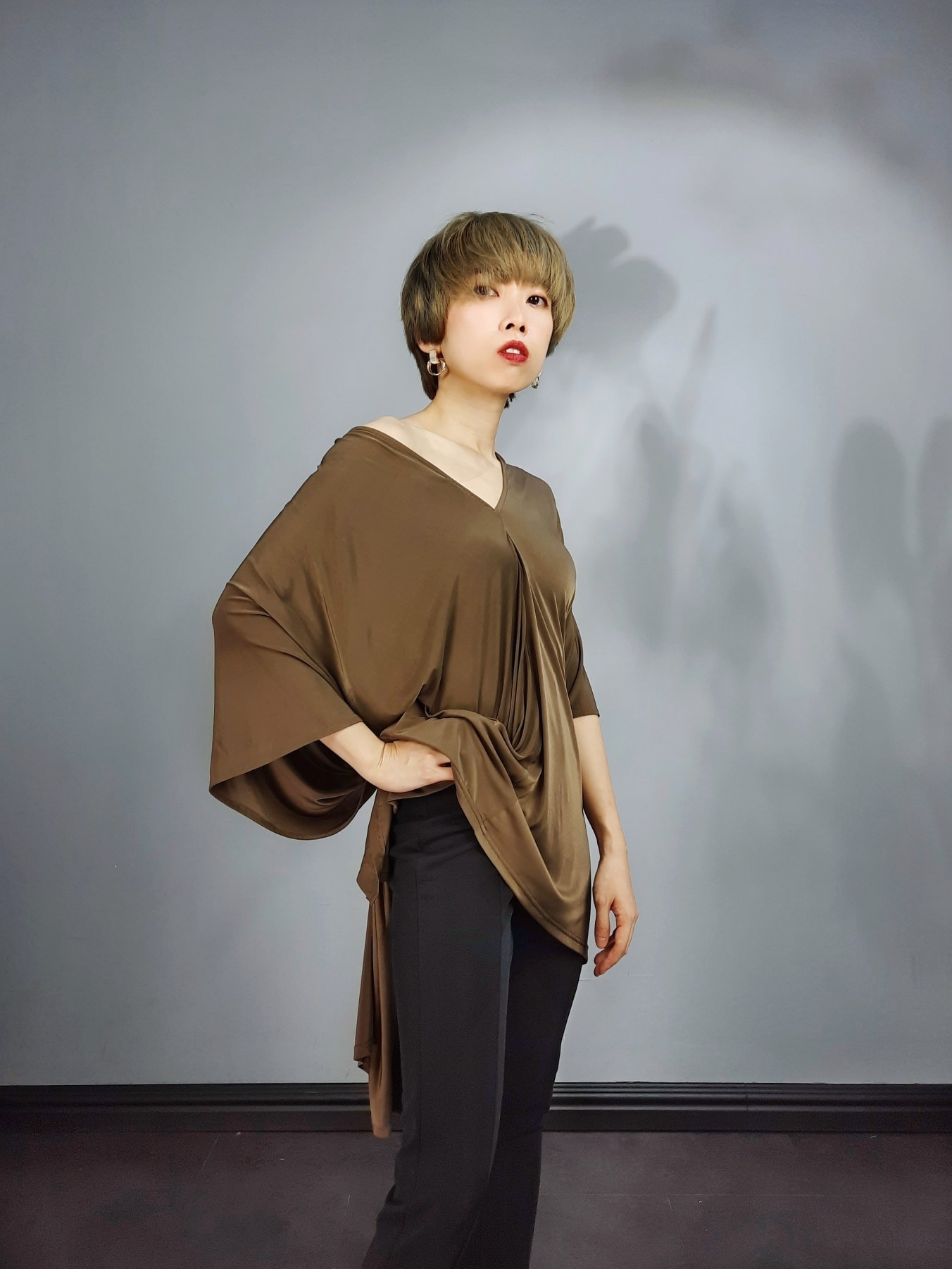 This is a highly versatile, fluid tunic in a brown/taupe color, demonstrating three distinct styling options: Relaxed Caftan: Worn loose, flowing, and oversized. Asymmetrical Drape: Folded and pulled to create a structured, one-shoulder wrap effect. Knotted Tunic: Gathered and tied at the front to cinch the waist and define the silhouette.